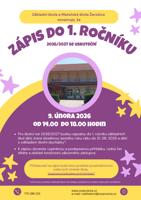 připravujeme zápis do 1. ročníku. Zápis proběhne již 9. února 2026. Veškeré podrobnosti zveřejníme do 19. prosince 2025. Registraci spustíme v předvánočním týdnu. Těšíme se na setkání