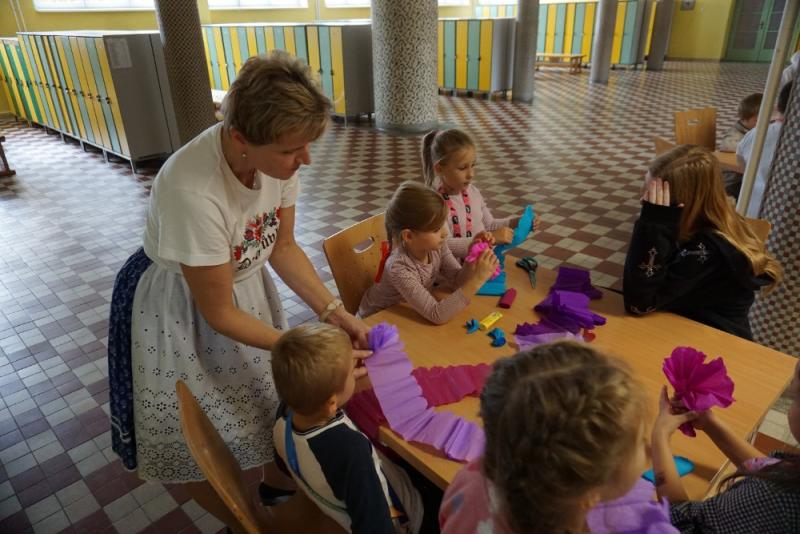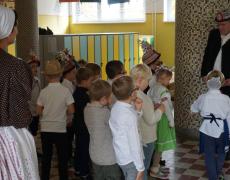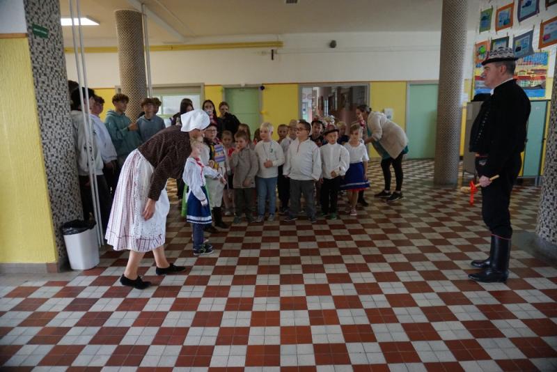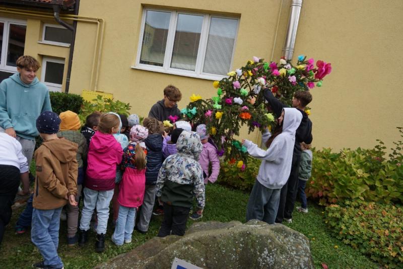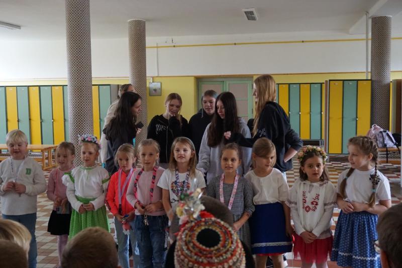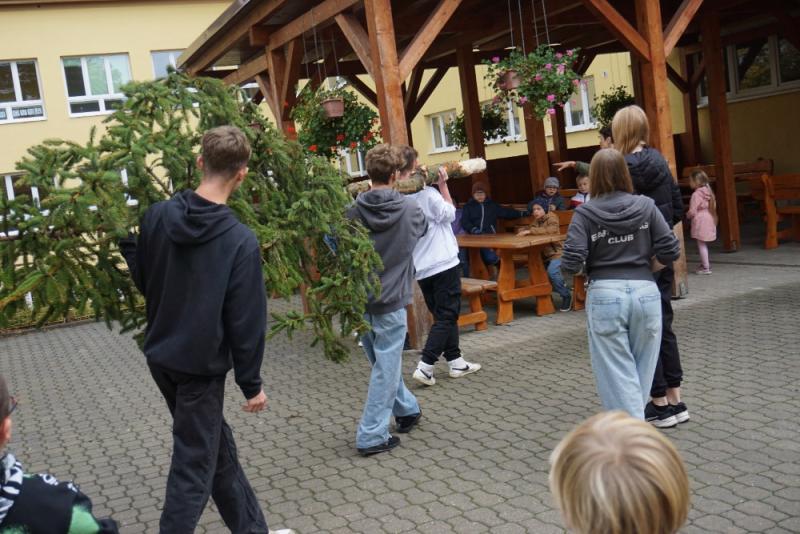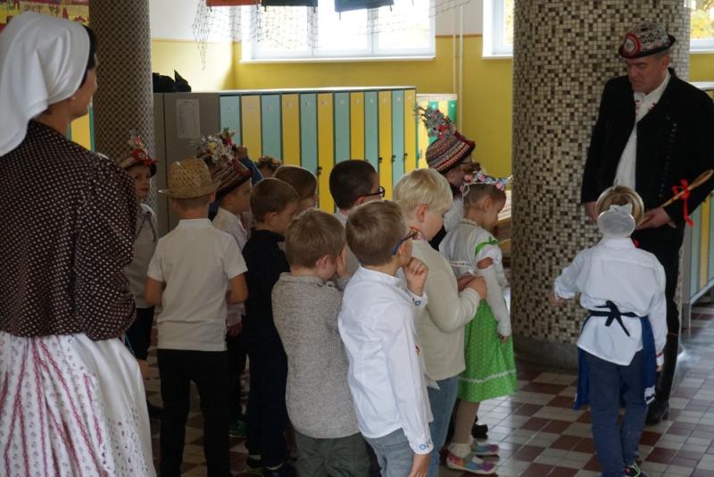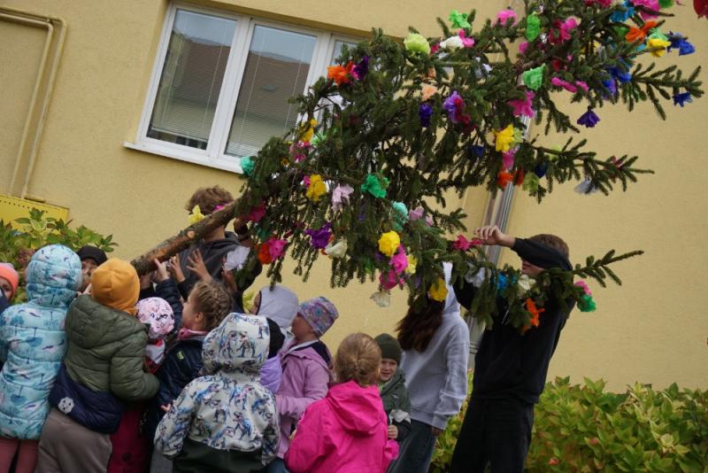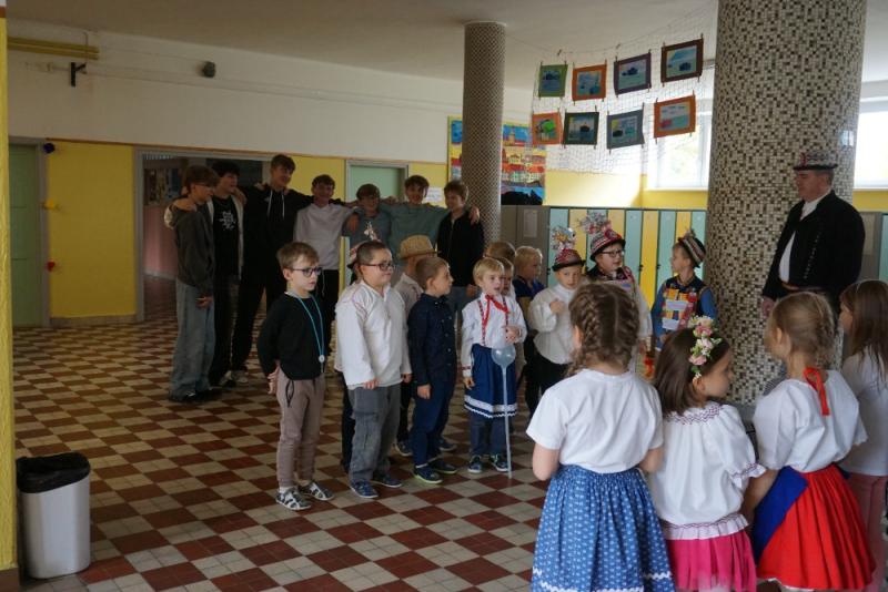 Opět se sešli žáci 1. a 9. ročníku, aby spolu něco zažili. Tentokrát si zkusili hody nanečisto. Kdo mohl, oblékl si kroj. Nechyběl ani sklepník a stárka se stárkem. Nejprve jsme začali vyrábět růže na májku, kterou jsme pak před školou nazdobili. Vyzkoušeli jsme si i stavění máje a samozřejmě nechybělo ani žádání pana starosty o povolení hodů a předání práva. Písnička "Tlučů, tlučů, se nesla celým patrem školy, když si stárek "šel" pro stárku. Nakonec byli všichni pohoštěni koláčky i hodovým cukrovím. Právo bude příští rok předáno našim nástupcům.