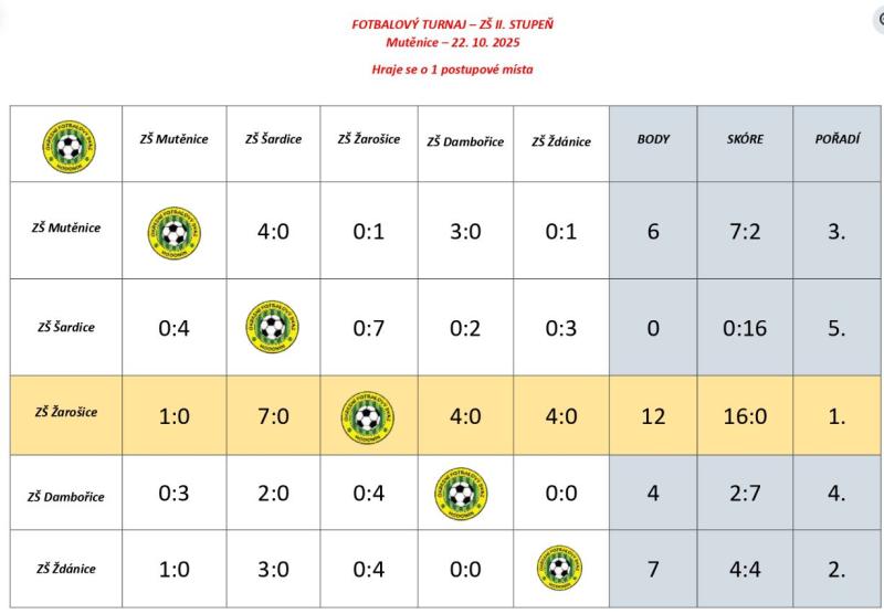 Dne 22.11.2025 jsme se zúčastnili turnaje ve velkém fotbale v Mutěnicích. Turnaj se nám velice povedl a zaslouženě jsme postoupili z prvního místa do dalšího kola. V turnaji jsme vstřelili suverénně nejvíce branek a ani jednou neinkasovali. Velká pochvala pro kluky.